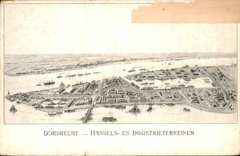 Ca. 1920 Industrieterrein Lijnbaan schip in aanbouw bij scheepswerk De Biesbosch woonwijk De Staart in aanbouw.